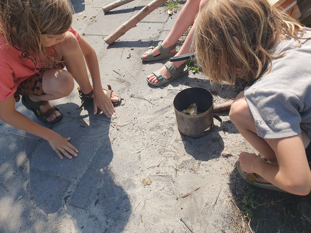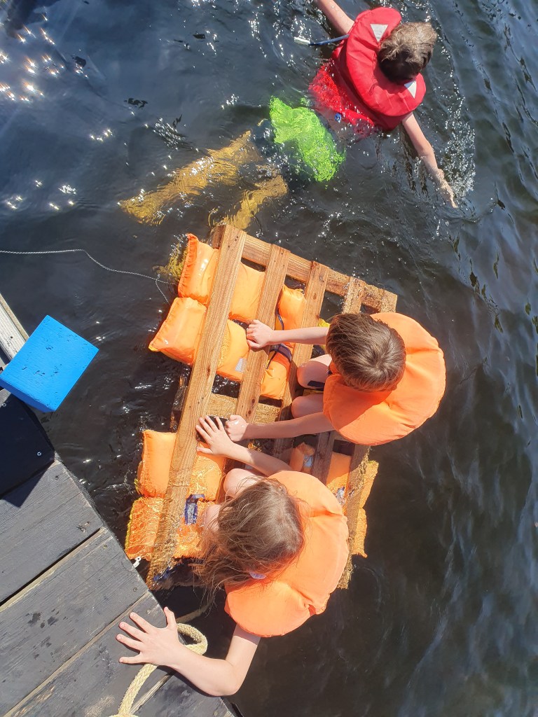 We hadden nog wat (hele) oude zwemvesten en pallets liggen. Met het weer vandaag leek ons het een goed idee om hiermee vlotten te gaan bouwen. Ook een mooi moment om de knopen weer eens te oefenen! Het bouwen ging in kleine groepjes heel gemoedelijk en alle vlotten bleven drijven. De een functioneerde wel wat beter dan de ander. Na alle waterpret is er ook nog heerlijk geëxperimenteerd met een vergrootgla met de hoop om zo een vuurtje te maken.