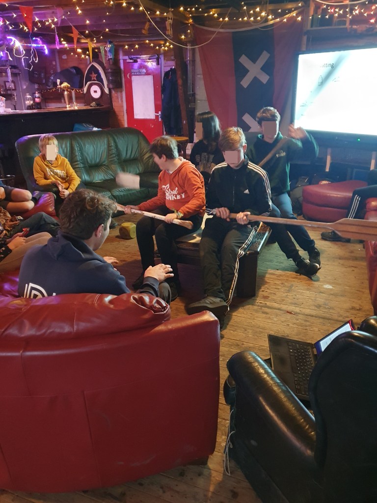 Wat was het weer nat vandaag. We hebben de boten gehoosd in de regen en zijn daarna binnen aan de slag gegaan met het onderhoud aan de houten delen van de vletten. Ook hebben we geoefend met knopen, zowel praktische knopen als sierknopen. Vorige week hebben we roeicommando’s geoefend, vandaag hebben we ze droog herhaald, niet met riemen maar met kleinere peddels, want een riem is veel te groot om binnen mee te oefenen. We duimen voor een drogere zaterdag volgende week, dan gaan we nog een keer op het water oefenen.