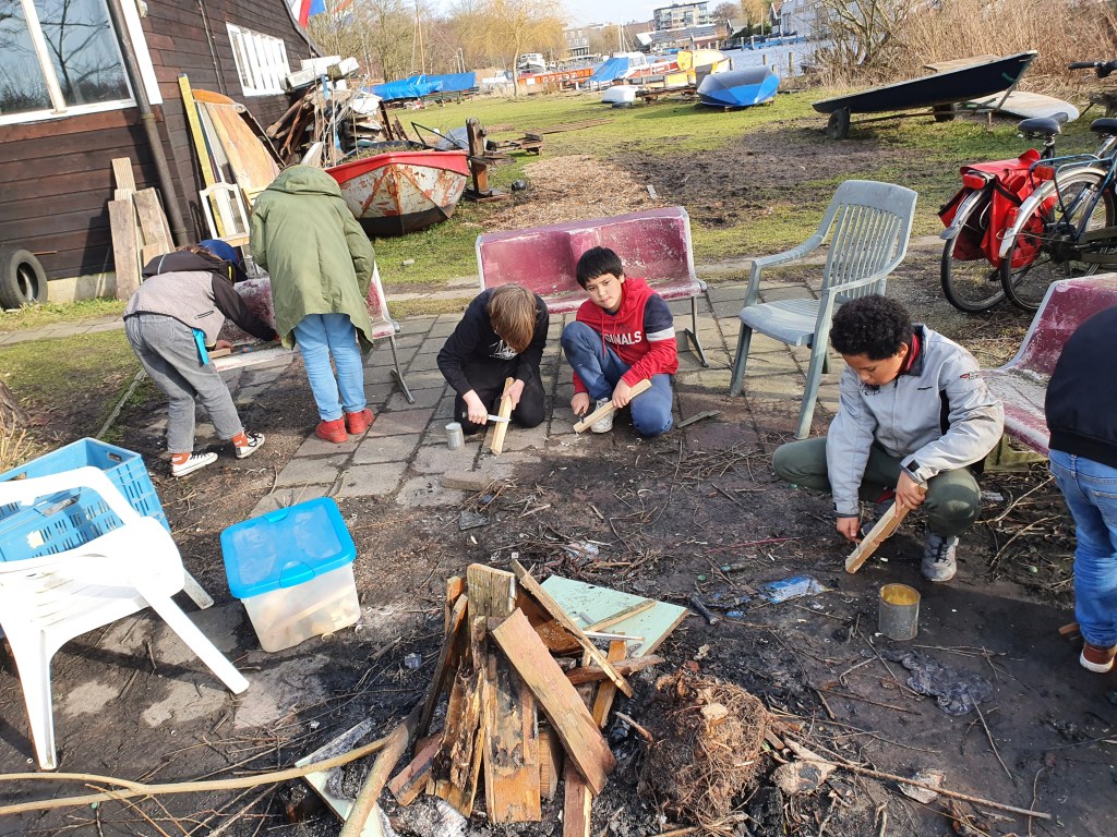 Terwijl dat groepje aan het schilderen was, werden de andere kinderen vermaakt met volleybal, vrij spelen en een parcours. De grotere jongens zijn ondertussen druk bezig met het onderhoud aan de boten, zeker nu het mooi weer wordt, hopen we dat de boten vlot het water in kunnen! Aan het eind van de middag hebben we genoten van de ondergaande zon bij een vuurtje.